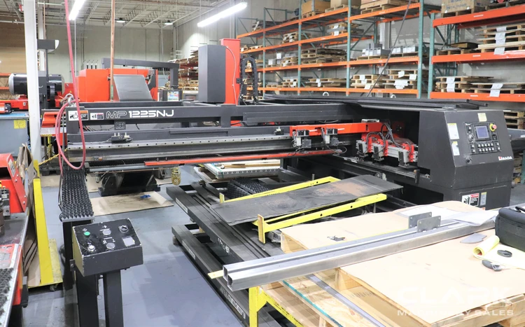 Discover this lightly used 2006 AMADA MP1225NJ Load/Unload system designed to work efficiently with materials such as Mild Steel, Stainless Steel, and Aluminum with a thickness range from 27.5" to 11.8". Its maximum sheet size is 4' x 8', while the minimum is 11.8" x 27.5". The system boasts a 4,400 lb material cart weight capacity and a 10.25" max loading height. Additional equipment includes a Material Separation Edge Lifter, a Magnetic Separator, and two Pallets for raw materials and finished parts. Electrical requirements are 200V - 3 phase, with a 10 KVA supply capacity and 75 PSI., 31.8 CFM air requirements. Ready for immediate purchase!