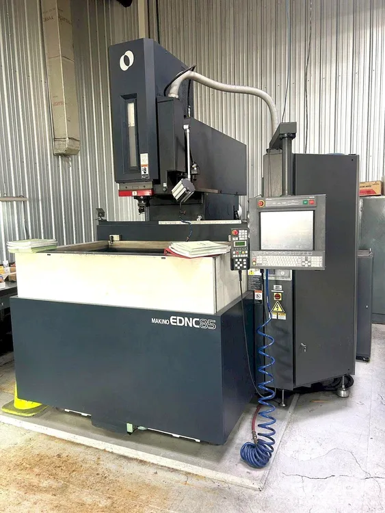 MAKINO EDNC85 EDM, 2014, featuring 31.49" X-axis, 19.68" Y-axis, 15.74" Z-axis, 43.3" x 27.55" work table, 6,615 lb max load, 55.1" x 35.4" x 19.68" work tank, 1,200 gal dielectric, MGH6 CNC control, drop tank, magnetic chuck, fluid chiller, transformer.