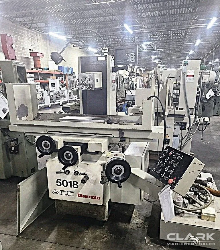 OKAMOTO ACC-8-20ST used surface grinder, 8"x20" table, 2 HP motor, equipped with 3-axis hydraulic feed, power rapid wheel positioning, Newall DRO, and coolant system. Note: Missing wheel guard. 3-phase, 220/440V. Ready for inspection & purchase.