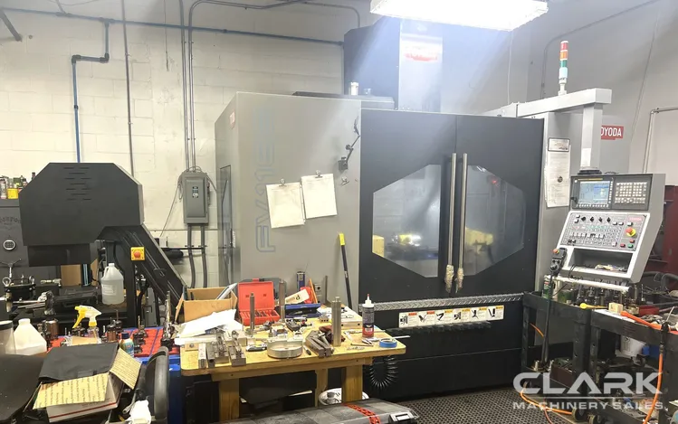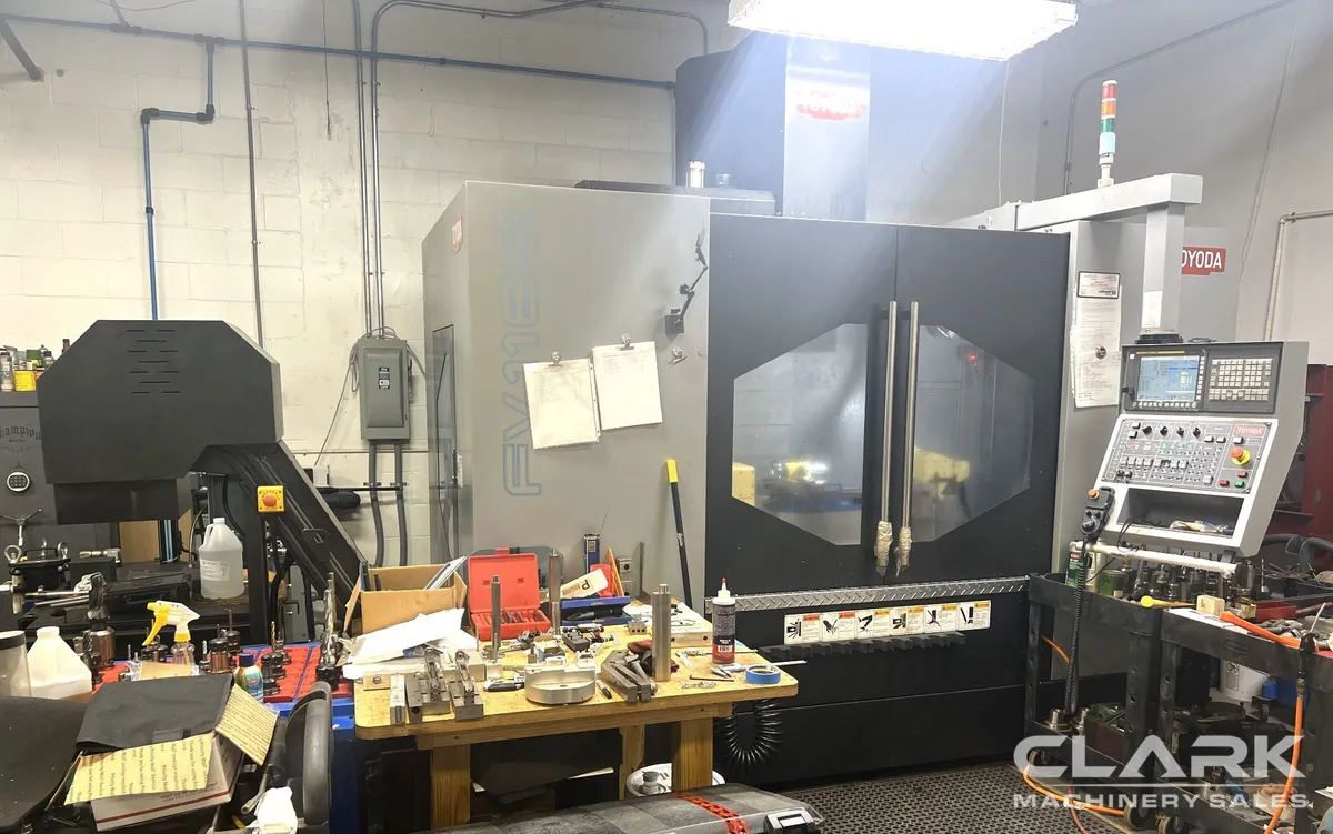 600 Cutting Hours, 5th Axis Ready, 1,000 PSI Coolant Thru Spindle, Probing, Fanuc. Installed in 2019 and equipped with geared head and box way construction, this originally owned 2018 Toyoda FV-1165 CNC vertical machining center has been cutting aluminum and also includes z-axis riser, dual augers, and chip conveyor.