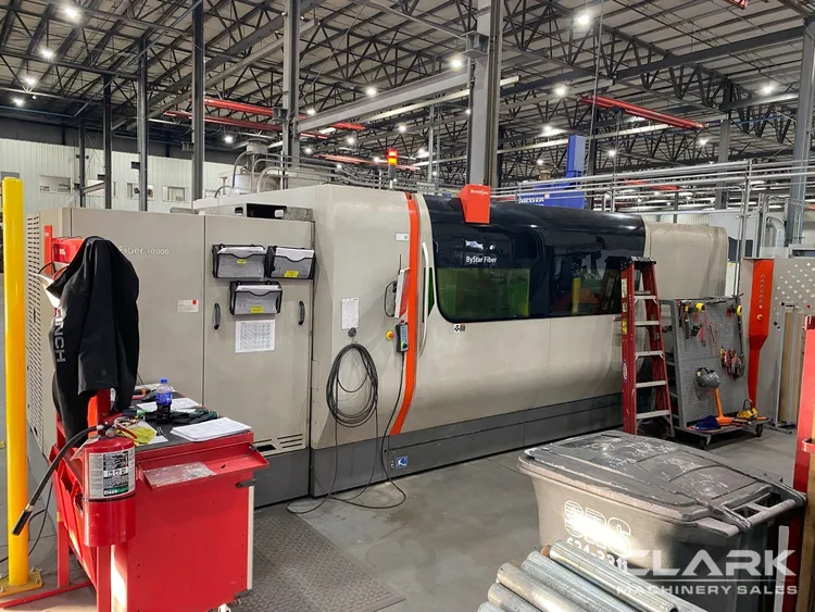 BYSTRONIC BYSTAR FIBER 4020 laser, 2019 model, 10,000W, 80"x160" sheet capacity. Features upgraded SSC V2 cutting head, dual pallet shuttle, dust collector, auto nozzle changer, chiller. Cutting: 7,731 hrs. Decommissioning/loading included.