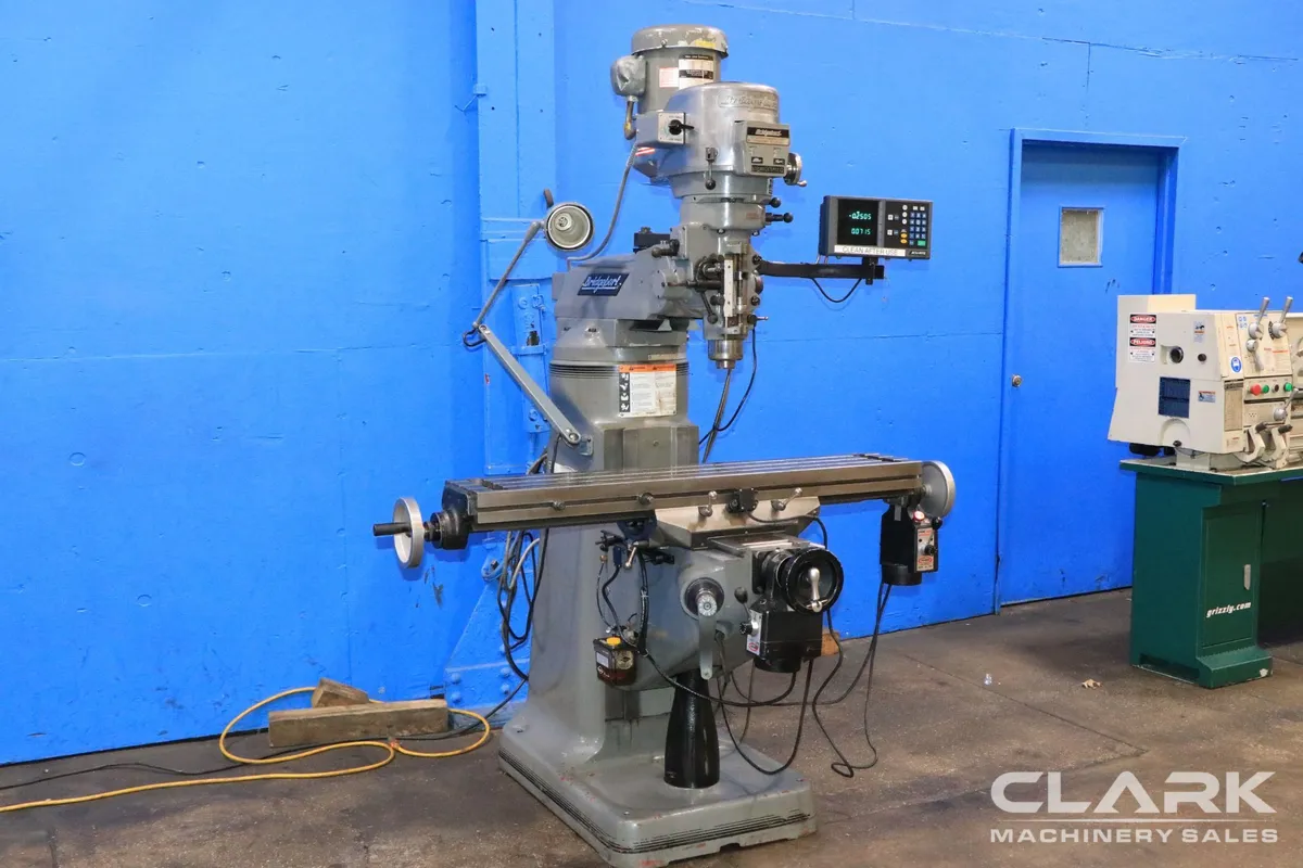 2002 Bridgeport Series I Vertical Mill, featuring 9"x48" table, 36"x12"x5" travel, 2 hp motor, 4,200 RPM. Equipped with AcuRite 2-axis digital readout, chrome ways, spray mist coolant system, and power feeds. Ideal for precise machining tasks.