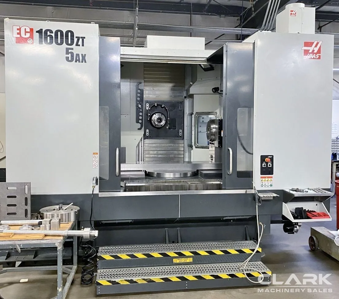 This 2022 HAAS EC-1600ZT-5AX has a 4th-axis rotary platter integrated into the T-slot table that provides ± 30 degrees of tilt. The 5th-axis consists of an HRT310 with an A-frame support mounted on a removable riser block that can support a part up to 55.875" long. This machine is in like-new condition, with only 500 Cutting Hours.