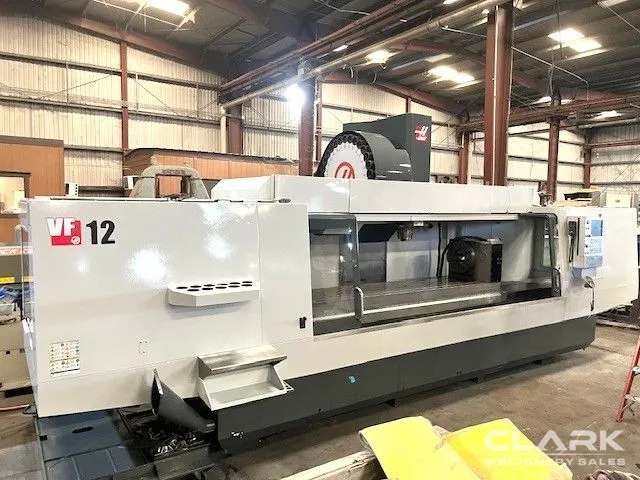 2014 HAAS VF-12/50 with HRT-450 rotary table and 1000 PSI Through Spindle Coolant. Features: 150" x 28" table, 30 hp motor, 7,500 RPM spindle, CAT 50 taper, 30-tool capacity, high-pressure coolant, 2-speed gearbox, 4-axis capability, user macros, rigid tapping, and more.