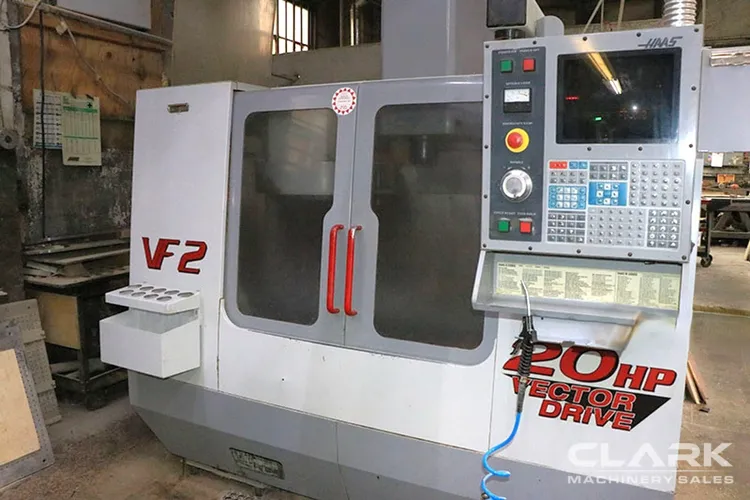 2001 HAAS VF-2B Vertical Machining Center for sale. Features 30"x16"x20" travels, 7,500 RPM spindle with 20 hp motor, CAT 40 taper, 20-tool ATC, HAAS control with high-speed machining, and rigid tapping.