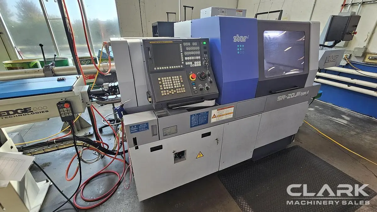 2021 STAR SR-20JII Type A Swiss Screw Machine, used, features 20 mm bar capacity, 10,000 RPM spindles, and 3.7 kW motors. Includes FANUC 321-B CNC, 12' capacity Edge Scout 320 barfeed, and more. Professionally decommissioned and ready for immediate delivery.