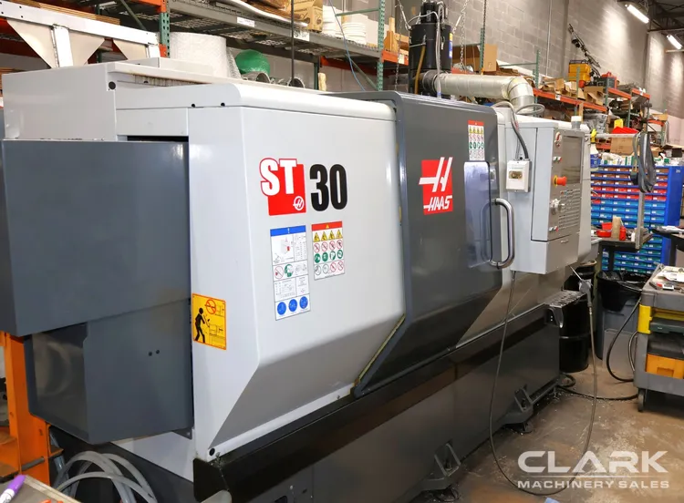 2018 HAAS ST-30 CNC lathe, 2-axis, used, with gearbox and probing. Features include 31.75" max swing, 30 hp spindle, 3200 RPM, 12" chuck, 1000 PSI high-pressure coolant. Cutting time: 2,067 hours.