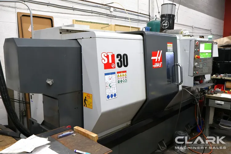 2017 HAAS ST-30 CNC lathe, 2-axis, used, with gearbox. Features include 31.75" max swing, 30 hp spindle, 3200 RPM, 12" chuck, 1000 PSI high-pressure coolant. Cutting time: under 3,300 hours.