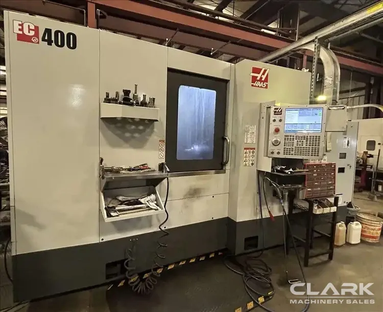 2019 HAAS EC-400 Horizontal Machining Center, featuring 12,000 RPM CAT 40 spindle, 50 ATC, and through-spindle coolant. Includes chip conveyor and CAT 40 tool holders. Tombstones not included. Ideal for high-efficiency machining needs.