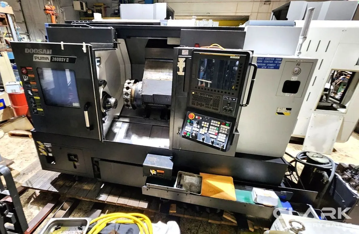 Y-Axis, Live Milling, Sub Spindle, LNS Chip Blaster, Oil Chiller, Chip Conveyor. This box-guideway 2021 Doosan Puma 2600SY II multi-axis CNC lathe is under power and available immediately. Live tool holders as pictured included. Available immediately.