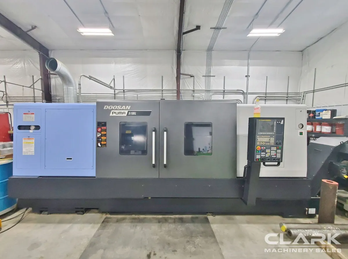 Rare Find, Like-New, Available Immediately! 2018 Doosan Puma 5100LC. Fanuc Control, 24" chuck, 10.8" Spindle Bore, 80" Turning Length, Tailstock, Chip Conveyor, Box Ways, like-new, only 230 Cutting Hours. In plant, under power and available immediately.