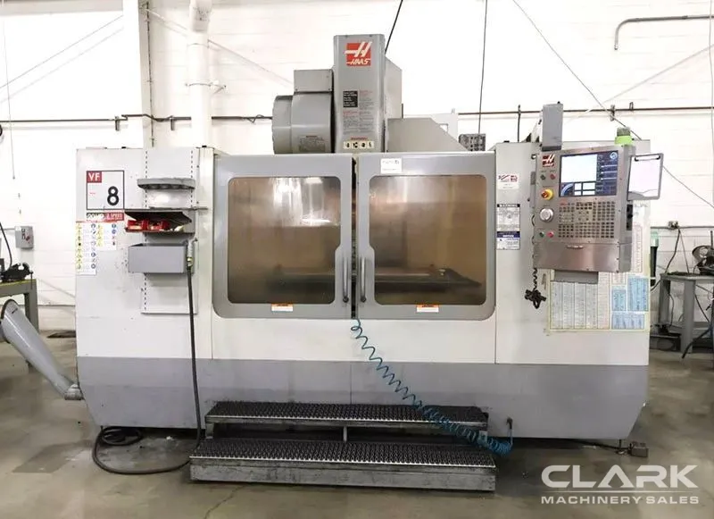 2007 HAAS VF-8B/40 vertical machining center features a 64" x 36" table, 20 hp, 8,100 RPM, 24 ATC, and HAAS CNC control. Equipped with spindle orientation, rigid tapping, and programmable coolant for enhanced precision and efficiency.