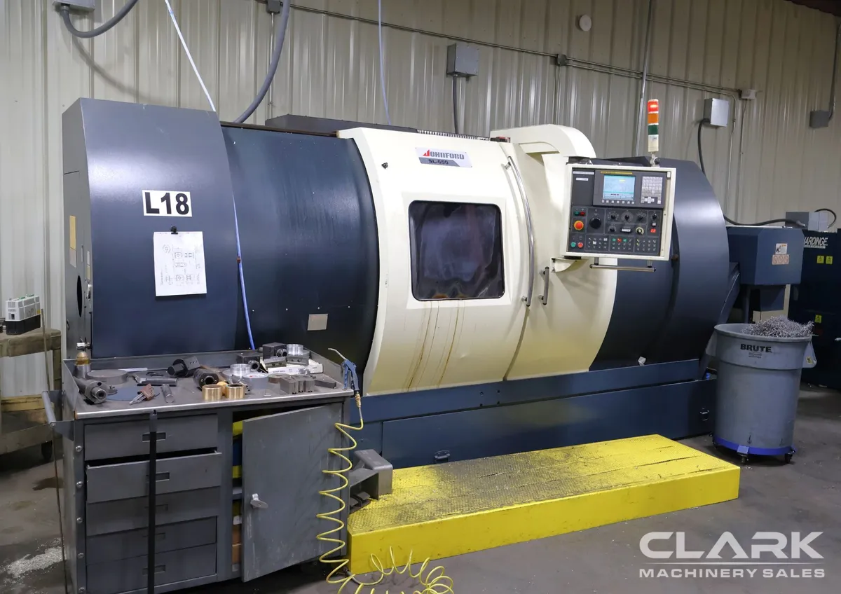 2005 Johnford SL-650-CS CNC Lathe with live milling, barfeed, and FANUC OI-TC CNC control. Features a 10" chuck, 25 hp motor, and 3500 RPM speed. Equipped with chip conveyor, tool touch setter, and more. CUTTING TIME: 3,823 HOURS. Immediate availability.