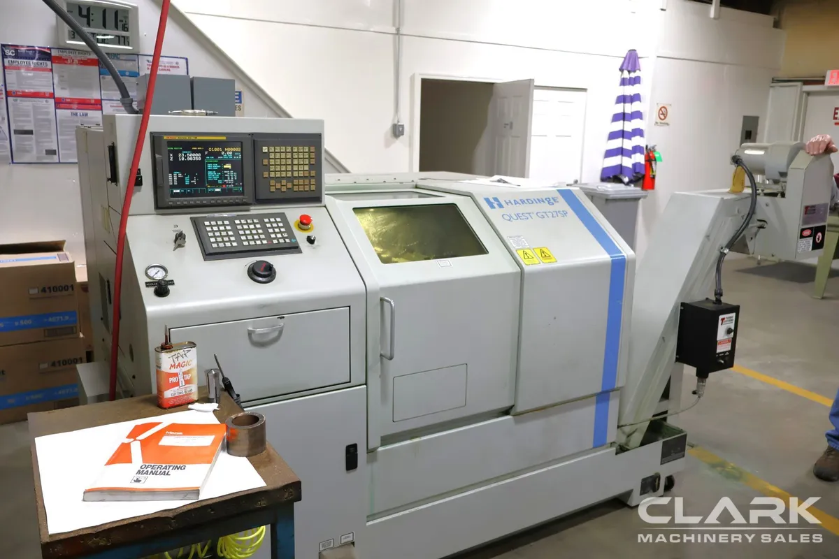 2005 Hardinge Quest GT27SP (Super Precision) Lathe, used, features 11.76" swing, 4" chuck, 1.062" bar capacity, 5 hp motor, 8,000 RPM max. Equipped with GE Fanuc 21i-TB CNC, Turbo chip conveyor, gang tooling, collet chuck. Available for inspection and purchase.
